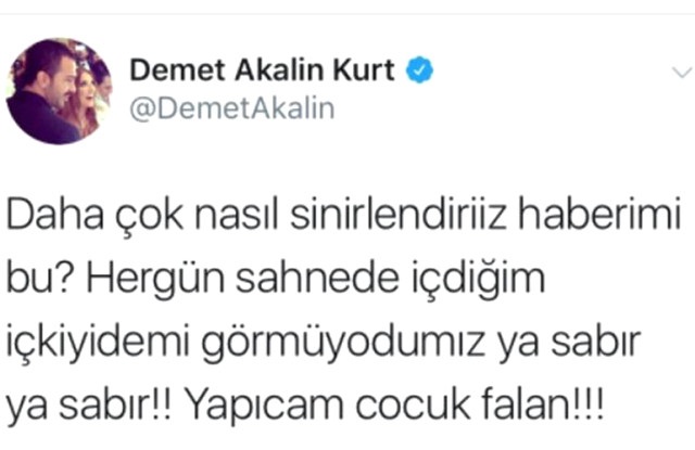Demet Akalın, hamilelik haberlerinin ardından sosyal medya hesabından açıklama yaparak iddialara son noktayı koydu. Akalın, “Daha çok nasıl sinirlendiririz haberi mi bu? Her gün sahnede içtiğim içkiyi de mi görmüyorsunuz? Ya sabır, ya sabır! Yapmayacağım çocuk falan” dedi.