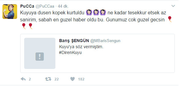 Beykoz Dereseki Mahallesi’nde sondaj için açılan kuyuya 10 gün önce yavru köpek düştü. İhbar üzerine itfaiye ekipleri ve hayvanseverler yavru köpeği kurtarmak için çalışmalara başladılar . İtfaiye ekipleri bir insanın giremeyeceği genişlikte olan kuyudaki yavru köpeği kurtarmak için bütün yolları deniyor. Ekipler yağmur ve hava şartlarından etkilenmemesi için yavru köpeğin düştüğü kuyunun üstüne çadır çekti. Durumu öğrenen hayvansever de olay yerine giderek kurtarma çalışmalarına katıldı. Kuyuya sarkıtılan bir kamera sayesinde görüntülenen köpeğin yüzündeki korku ifadesi tüm insanları etkilemişti.