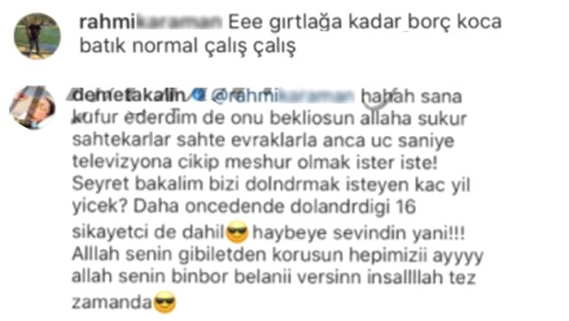 Kendisine bu sözleri yazan sosyal medya kullanıcısına yine aynı paylaşımın altına yaptığı yorum ile yanıt veren Demet Akalın, “Aslında sana küfür ederdim. Zaten sen de onu bekliyorsun, farkındayım. Seyret bakalım, bizi dolandırmak isteyen kaç yıl yiyecek? Boş yere sevindin. Allah senin gibilerden korusun hepimizi ayy… Allah senin binbir belanı versin tez zamanda” yorumunu yazdı.