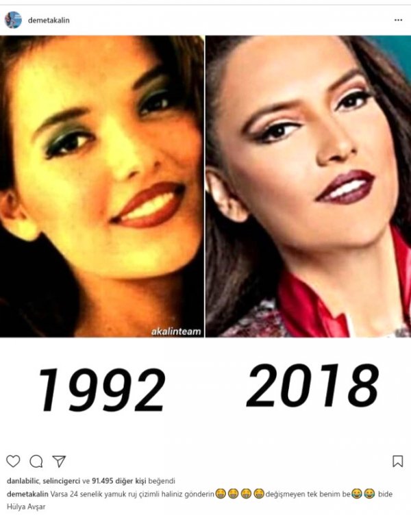 Demet Akalın, yoğun konser maratonuna devam ediyor. Demet Akalın, bu yılın yaz aylarında en çok sahne alan sanatçıları arasında yerini alıyor. Gündemde sosyal medya paylaşımlar ile sık sık gündem olan Demet Akalın, son paylaşımı ile yine dikkatleri üzerine çekmeyi başardı. Demet Akalın, 26 yıl önce çektirdiği fotoğrafıyla şimdiki halini paylaştı. Ruj sürme tekniğim aynı diyen ünlü şarkıcı, estetik yaptırmadığını ise “Varsa 24 senelik yamuk ruj çizimli haliniz gönderin? Değişmeyen tek benim be. Bir de Hülya Avşar” diyerek paylaşımda bulundu…