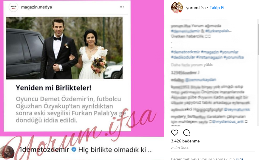 Bu haberler konuşulurken güzel oyuncu Demet Özdemir sessizliğini bozdu. Sosyal medyada haberler yayınlayan bir sayfada Furkan Palalı ile tekrar birlikte olduğu haberinin altına yorumda bulundu. Demet Özdemir konu ile alakalı “hiç birlikte olmadık ki…” yorumunu yaparak hakkında çıkan aşk dedikodularını yalanladı.