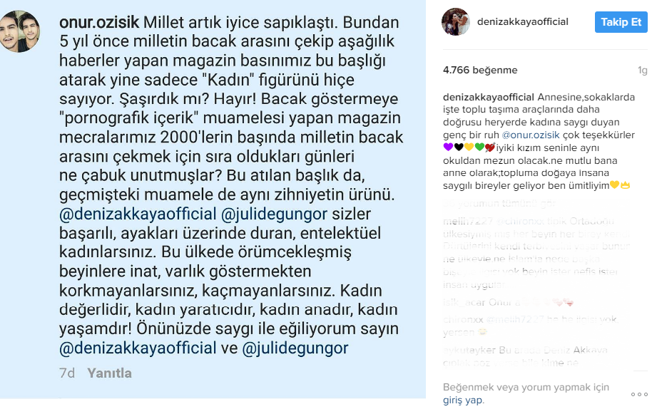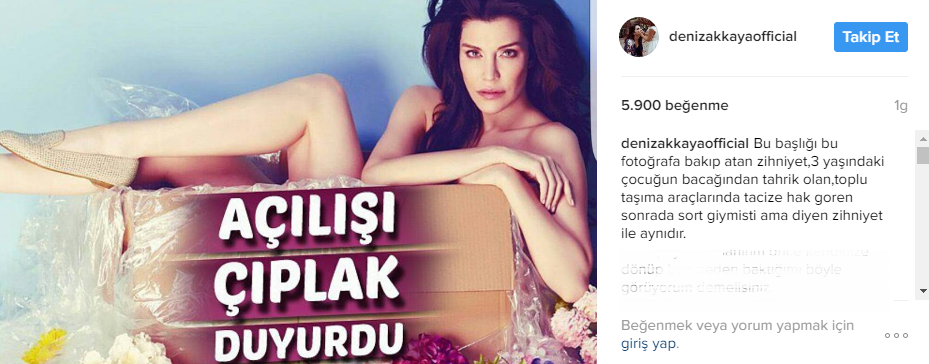 Deniz Akkaya çıplak olduğu iddie edildiği fotoğrafı sosyal medya hesabına yükleyerek “Bu başlığı bu fotoğrafa bakıp atan zihniyet,3 yaşındaki çocuğun bacağından tahrik olan,toplu taşıma araçlarında tacize hak goren sonrada sort giymisti ama diyen zihniyet ile aynıdır.