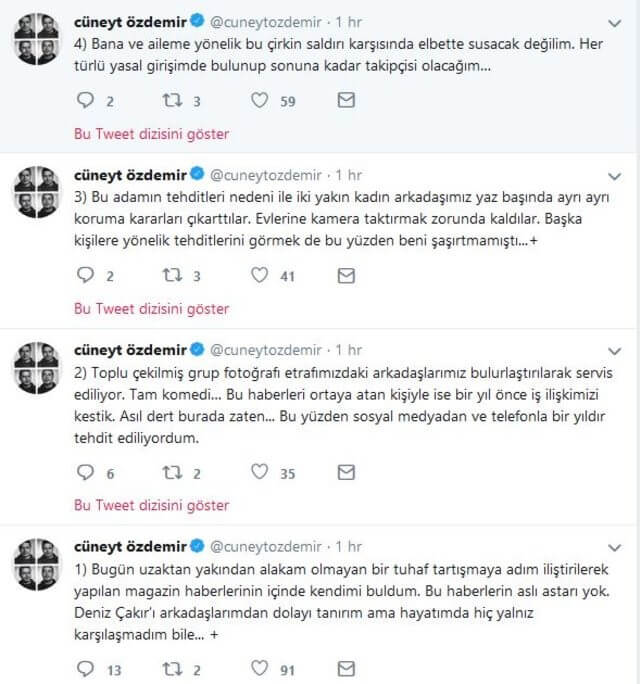 İddiaların ardından Cüneyt Özdemir de sosyal medya hesabından açıklama yaptı ve Deniz Çakır’la yalnız görüşmediğini, söz konusu ifadenin geçen yıl işten çıkardıkları için tehdit eden bir çalışanı tarafından ortaya atıldığını ve yasal yollara başvuracağını söyledi.