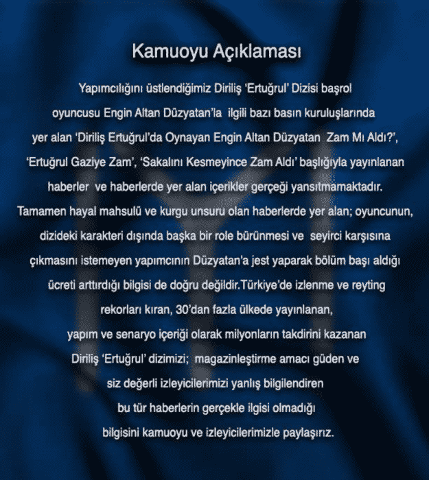 Konuyla ilgili bir süre sessiz kalmayı tercih eden Diriliş Ertuğrul ekibi, sonunda sosyal medya hesaplarından kamuoyu duyurusunda bulundu ve Engin Altan Düzyatan’a zam yapıldığı iddialarını yalanladı. İşte o açıklama: