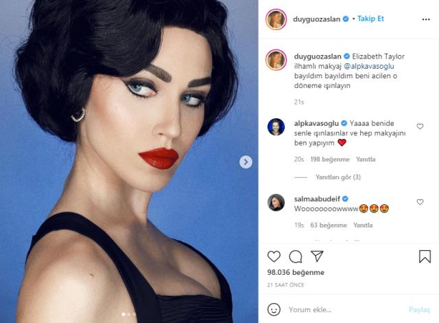 Makyajının ardından büyük bir değişim yaşayan Duygu Özaslan, fotoğrafını “Elizabeth Taylor ilhamlı makyaj. Bayıldım bayıldım beni acilen o döneme ışınlayın” notuyla sosyal medya hesabından paylaştı. Takipçilerinin tanımakta güçlük çektiği Özaslan, binlerce beğeni alırken, art arda “Bu kim” yorumları aldı.