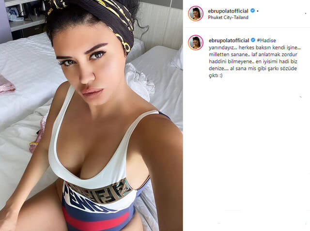 Magazin basınında yeni bir tartışma yaratan Hadise’nin bu sözlerine ise en büyük destek şarkıcı Ebru Polat’tan geldi. Sosyal medya hesabından yaptığı dikkat çekici paylaşımlarla sık sık gündeme gelen Ebru Polat ise meslektaşına gelen eleştirilere sessiz kalamadı. Şimdilerde ailesiyle Phuket Adası’nda tatilde olan Polat, mayolu dekolteli bir pozunu paylaşarak “Hadise yanındayız. Herkes baksın kendi işine, milletten sana ne. Laf anlatmak zordur haddini bilmeyene” dedi.