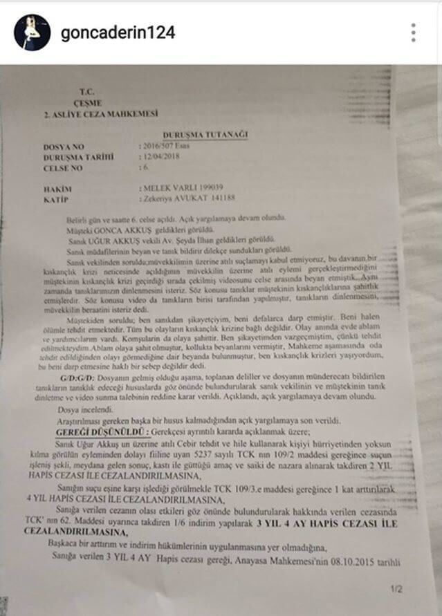 Uğur Akkuş’un, Ebru Şallı ile aldatılan eşi Gonca Derin, Uğur Akkuş hakkında ‘kendisini darp ettiğini ve ölümle tehdit ettiği’ gerekçesi ile mahkemeye başvurmuştu. Görülen davada, mahkeme Uğur Akkuş’a iki yıl hapis cezası verdi. Gonca Derin, mahkeme kararını sosyal medya hesabından paylaştı.