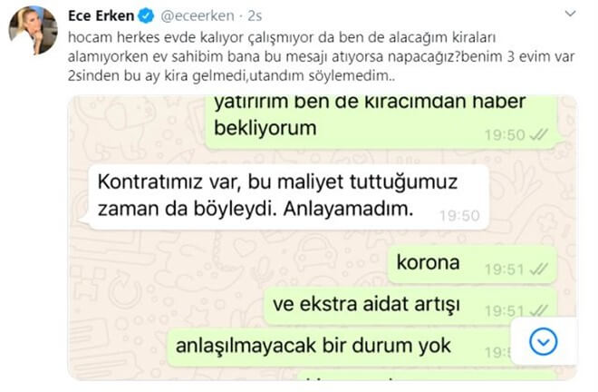 Ünlü sunucu Ece Erken, kirayı isteyen ev sahibi ,ile yaptığı konuşmayı sosyal medya hesabından paylaşarak, “Hocam herkes evde kalıyor çalışmıyor da ben de alacağım kiraları alamıyorken ev sahibim bana bu mesajı atıyorsa ne yapacağız? Benim 3 evim var, 2’sinden bu ay kira gelmedi, utandım söylemedim” dedi.