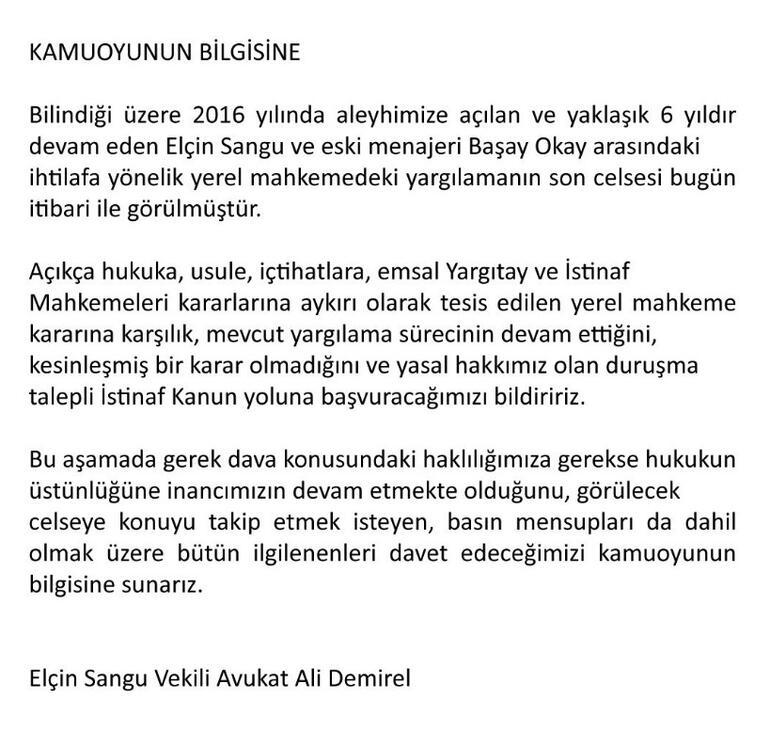 İstanbul Asliye Hukuk Mahkemesi’nde görülen davanın karar duruşmasına Başay Okay’ın avukatı ile Elçin Sangu ve avukatı katıldı. Okay’ın avukatı, “Müvekkilim Elçin Sangu’yu keşfedip İzmir’den İstanbul’a getirmiştir. Diksiyon eğitiminden oyuncu koçluğuna kadar hepsiyle ilgilenip çeşitli dizilerde rol almasını sağlamıştır. Ancak davalı sözleşmeyi haksız yere feshedip yeni bulduğu bir menajer ile aynı sözleşme imzalamıştır. Davamızın kabulünü istiyoruz” dedi.