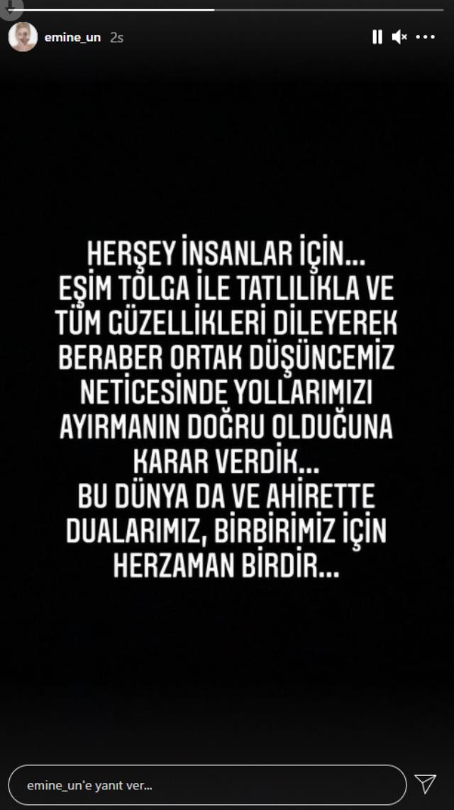 Emine Ün paylaşımında “Her şey insanlar için. Eşim Tolga ile tatlılıkla ve tüm güzellikleri dileyerek, beraber ortak düşüncemiz neticesinde, yollarımızı ayırmanın doğru olduğuna karar verdik. Bu dünyada ve ahirette, dualarımız birbirimiz için her zaman birdir…’ sözlerine yer verdi.
