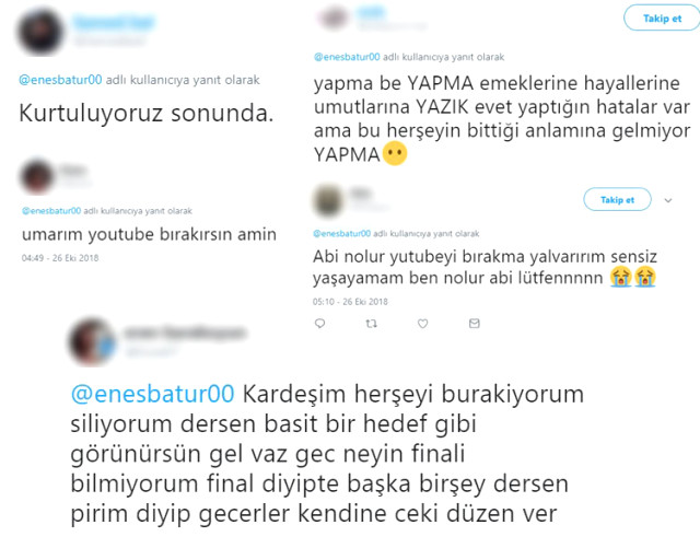 Sosyal medya fenomeni Enes Batur’un paylaşımlarından sonra YouTube hesabını kapatıyor iddiaları ise kısa sürede sosyal medyada yayıldı. Batur’a olumlu mesajlarının yanı sıra bir çok kullanıcıdan da olumsuz yorumlar geldi.