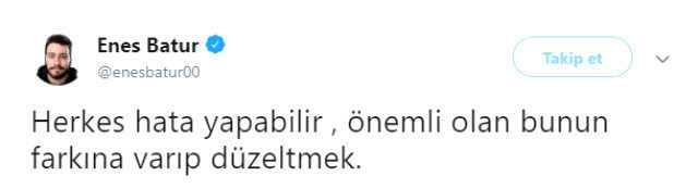 Batur, videoyu sildikten sonra Twitter hesabı üzerinden yaptığı açıklamada. Herkesin hata yapabileceğini söyleyen Batur, önemli olanın bunun farkına varıp düzeltmek olduğunu açıkladı.