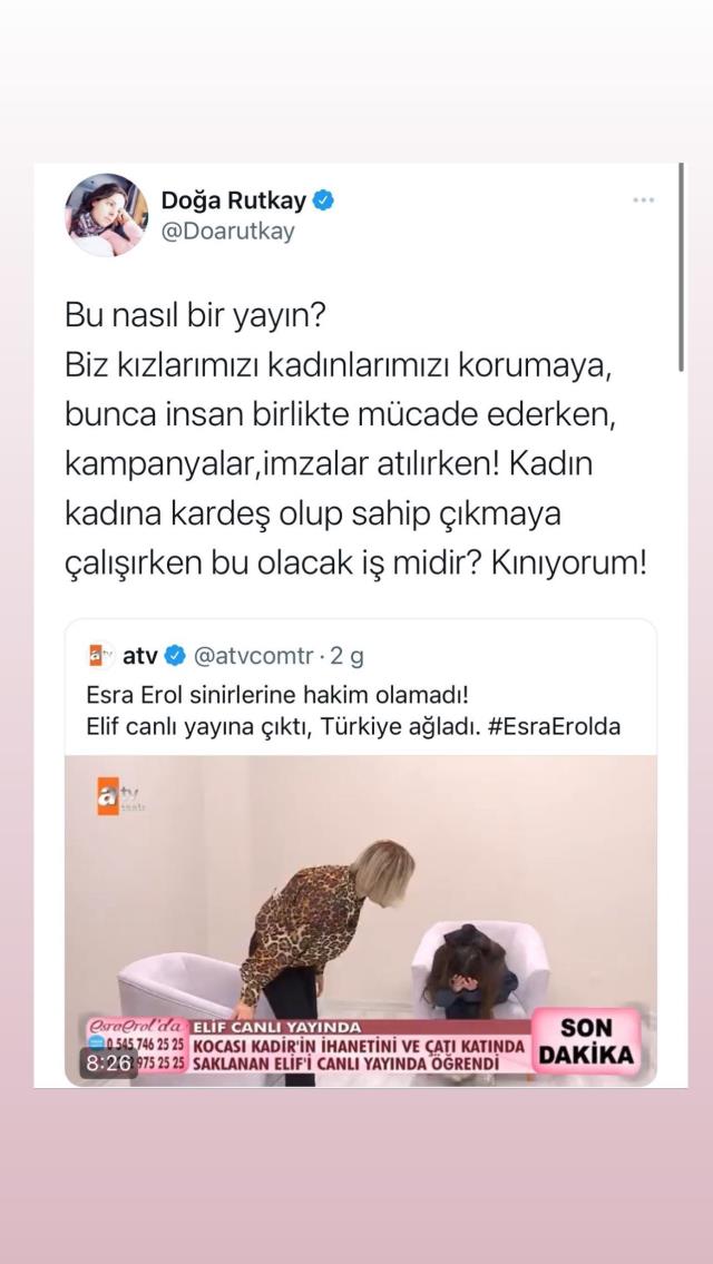 Kaya’nın ardından Doğa Rutkay’da Erol’u şu sözlerle eleştirdi: “Bu nasıl bir yayın? Biz kızlarımızı kadınlarımızı korumaya, bunca insan birlikte mücadele ederken, kampanyalar, imzalar atılırken! Kadın kadına kardeş olup sahip çıkmaya çalışırken bu olacak iş midir? Kınıyorum!” dedi.