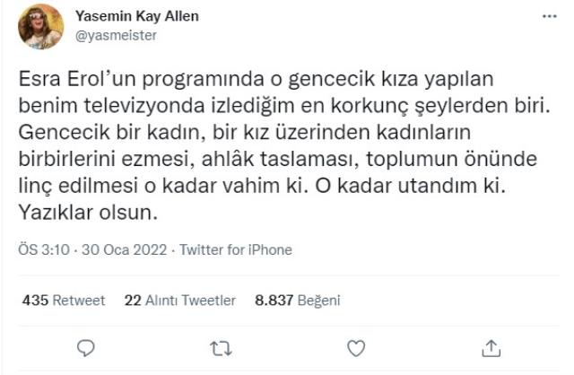 Erol’a bir tepki de Yasemin Kay Allen’dan geldi. Allen, “Esra Erol’un programında o gencecik kıza yapılan benim televizyonda izlediğim en korkunç şeylerden biri. Gencecik bir kadın, bir kız üzerinden kadınların birbirlerini ezmesi, ahlâk taslaması, toplumun önünde linç edilmesi o kadar vahim ki. O kadar utandım ki. Yazıklar olsun.”