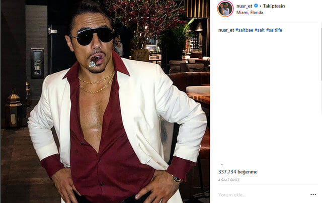 Sosyal medya fenomenleri arasında yer alan ünlü isim Nusret, paylaşımları ile hayranları tarafından yakın takipte. Sosyal medya hesaplarını sıklıkla kullanan Usta kasap Nusret, paylaşımları ile dikkat çekiyor. Her paylaşımı ise sosyal medyada gündem oluyor. Son dönemde çok konuşulan ünlüler arasında yer alan Nusret, yine paylaştığı fotoğraf ile gündem olmayı başardı. Yaptığı her hareketiyle olay olan Nusret, düğmeleri açık bordo gömlek, beyaz ceket ve altın kolyesiyle takipçilerini şaşırttı. Ünlü kasap Nusret Gökçe’nin giyim tarzı ise sosyal medya gündeminde çok konuşuldu. Ünlü kasap ve işletmeci Nusret Gökçe’nin giyim tarzı takipçileri tarafından beğenildi. Nusret Gökçe’nin takipçileri, sosyete kasabının fotoğrafına kısa sürede yüz binlerce beğeni attı…
