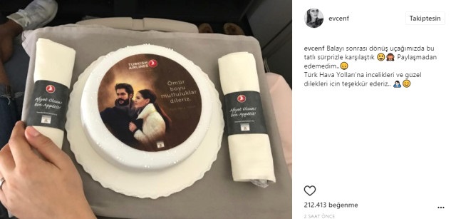 Çiftin tercih ettiği havayolu firması, balayından dönen Fahriye Evcen ve Burak Özçivit çiftine uçakta üzerinde resimlerinin bulunduğu ve “Ömür boyu mutluluklar dileriz” yazılı not işlenen bir pasta hediye ettiler.