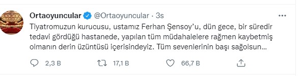 Ortaoyuncular Twitter hesabı ünlü sanatçının vefatını şu paylaşımla duyurdu: