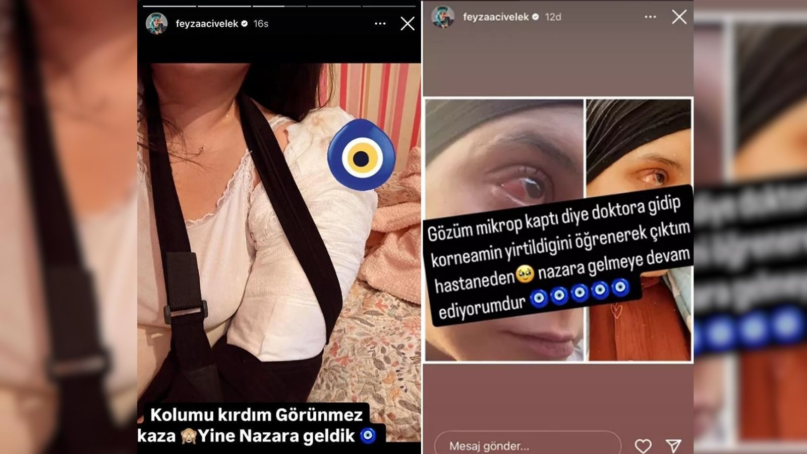“Görünmez kaza, yine nazara geldik” sözleriyle yaptığı paylaşımı o zaman da çok konuşulmuştu.Kısa sürede iyileşip ekranlara dönen Feyza Civelek, bu kez göz rahatsızlığıyla gündeme geldi. Sağlık sorununu sosyal medyadan sevenleriyle paylaştı.