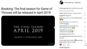 Uzun bir süredir merakla beklenen dizinin sekizinci sezonu yani final sezonunun ilk etapta 2019 yılı ile karşımıza çıkacağı duyurulmuştu. Büyük heyecan uyandıran dizinin final sezonu karşımıza daha erken çıkarak tarihini nostaljik bir video ile izleyicileriyle paylaştı.
