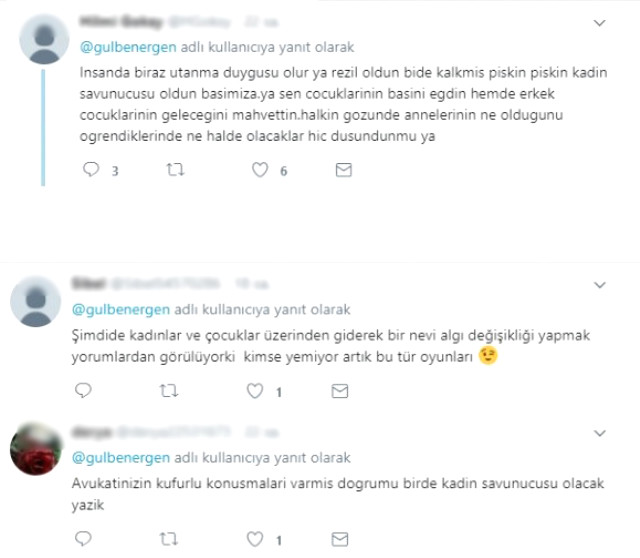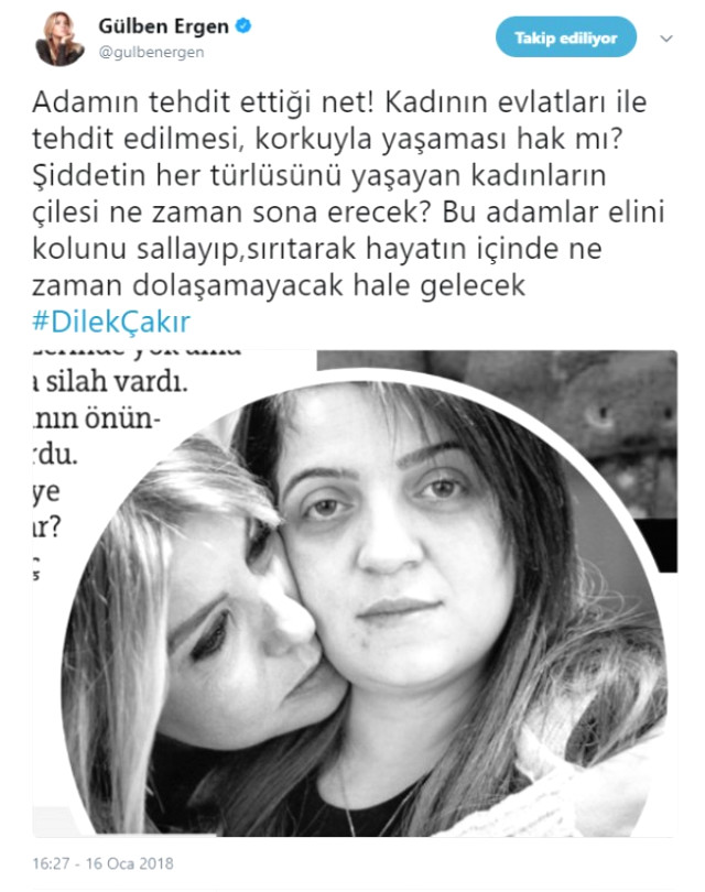 Gülben Ergen paylaşımının altına, “Adamın tehdit ettiği net! Kadının evlatları ile tehdit edilmesi, korkuyla yaşaması hak mı?Şiddetin her türlüsünü yaşayan kadınların çilesi ne zaman sona erecek? Bu adamlar elini kolunu sallayıp,sırıtarak hayatın içinde ne zaman dolaşamayacak hale gelecek #DilekÇakır ” sözlerini yazdı. Büyük bir kesim Gülben Ergen’a “utanma duygusu yok mu sende” şeklinde yorumlar yaptı.
