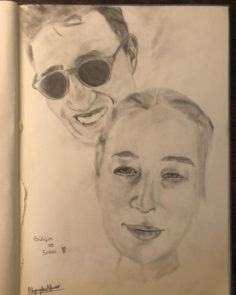 Karakalemle kendisi ve sevgilisi Erdal’ın fotoğrafını paylaşan Gülçin Ergül şu notu düştü;