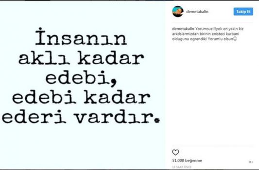 Ahu Yağtu’ya bir tepki de Demet Akalın’dan geldi. Özge Ulusoy ile dost olan Demet Akalın, Instagram hesabına şunları yazdı: “En yakın kız arkadaşlarımızdan birinin ‘Enişteci’ kurbanı olduğunu gördük. İnsanın aklı kadar edebi, edebi kadar aklı vardır!”