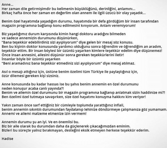 Şarkıcı Hadise, geçtiğimiz günlerde annesinin intihar ettiği haberleri ile gündeme bomba gibi düşmüştü. Şarkıcı Hadise, televizyon programında annesi Gülnihal Açıkgöz’ün intihar ettiğini söyleyen Nur Yerlitaş’a sosyal medya hesabı üzerinden sert açıklamalarda bulundu. İşte Hadise’den sert sözler…