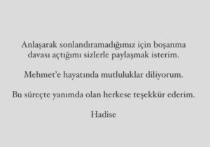 Bir süredir ayrılacakları konuşulan Hadise ve Mehmet Dinçerler evliliği bitiyor. Ünlü şarkıcı Hadise’den boşanma açıklaması geldi. İşte Hadise’nin o açıklaması;
