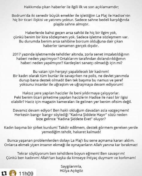 Her fırsatta kardeşlerine düşkünlüğünü anlatan Hadise’nin, ablasıyla da iş yaptığı biliniyor. Ablasının 200 bin liralık borcu nedeniyle ikinci kez haciz haberleriyle gündem de. Şarkıcı Hadise’nin ise borcun kısa zamanda ödeneceğini taahhüt ederek haczi durdurduğu söyleniyor. Diğer yandan Hadise’nin sosyal medya hesabından ablası Hülya Açıkgöz bir açıklama yayınladı. Açıklamada iddiaların gerçek dışı olduğu ileri sürüldü. İşte o açıklama;