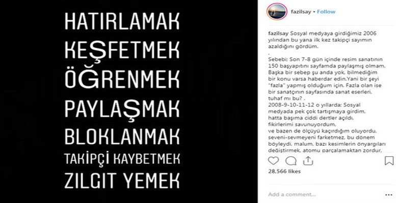 Sosyal medyaya girdiğimiz 2006 yılından bu yana ilk kez takipçi sayımın azaldığını gördüm. Sebebi; Son 7-8 gün içinde resim sanatının 150 başyapıtını sayfamda paylaşmış olmam. Başka bir sebep şu anda yok, bilmediğim bir konu varsa haberdar edin. Yani bir şeyi “fazla” yapmış olduğum için. Fazla olan ise bir sanatçının sayfasında sanat eserleri, tuhaf mı bu?