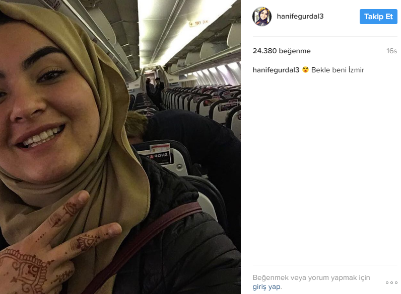 Daha sonra uçakta zafer işareti yaparak poz verdiği fotoğrafını paylaştı , fotoğrafı yorumlara kapatarak sadece “bekle beni İzmir” açıklamasında bulundu. Hanifenin gece yaptığı bir diğer paylaşımda ise arka fonda ben yoruldum hayat adlı şarkıda kırık kalp emojisi koyduğu ve İzmirde yer bildirimi yaptığını gören fanları Hanifenin bu günki programa katılıp katılamayacaağını merakla bekliyor.