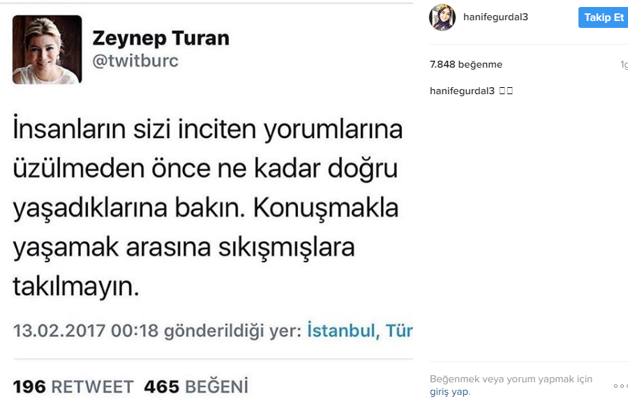 Hanife Gürdal isimli sosyal medya hesbından instastorye attığı fotoğrafla ”Artık İzmir’de ailemle birlikteyim. Soru sorup durmayın yokum bundan sonra, ilk kez yapmıyorum bu açıklamayı ama bu kez son. Telefon numaramı değiştirdim iş birliği yaptığım firmalar bana dm’den ulaşabilirler.” açıklamasında bulundu .