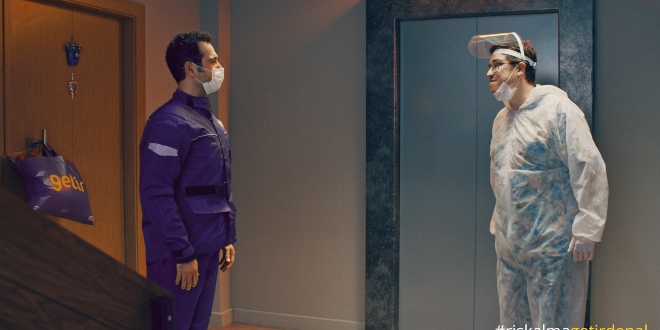 Necati şoku üzerinden atmadan merdivenlerde beliren “Getir” kuryesi ile atışmalarını konu alan reklamda, platformun kullanıcılarının ve çalışanlarının sağlığını korumak için hayata geçirmiş olduğu “siparişi kapıya bırak” özelliğine de atıfta bulunuluyor.