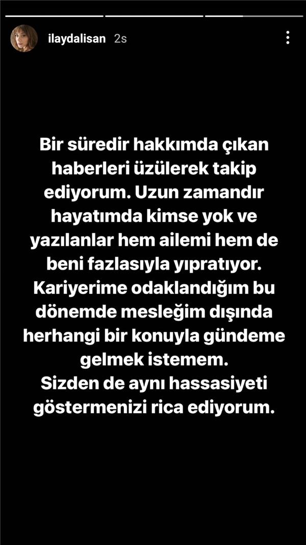 Oyuncu, “Bir süredir hakkımda çıkan haberleri üzülerek takip ediyorum. Uzun zamandır hayatımda kimse yok ve yazılanlar hem ailemi hem de beni fazlasıyla yıpratıyor. Kariyerime odaklandığım bu dönemde mesleğim dışında herhangi bir konuyla gündeme gelmek istemem. Sizdem de aynı hassasiyeti göstermenizi rica ediyorum” diye yazdı.