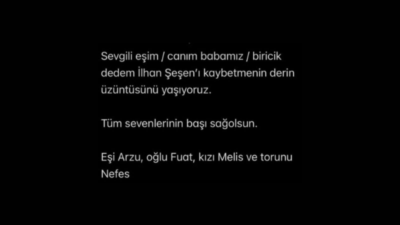 “Sevgili eşim, canım babamız, biricik dedem İlhan Şeşen’i kaybetmenin derin üzüntüsünü yaşıyoruz. Tüm sevenlerinin başı sağ olsun.”