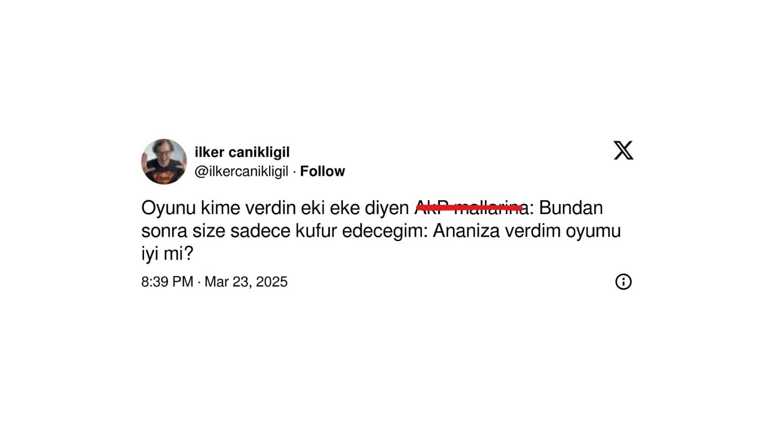 İlker Canikligil, daha önce de siyasi içerikli açıklamalarıyla dikkat çekmişti. 2023 seçimleri döneminde yaptığı bir paylaşımda “Enseyi karartmayın. Yapmanız gereken çok basit, AKP olmayana mührü basacaksınız. Bu kadar basit.” sözleriyle gündem olmuştu.