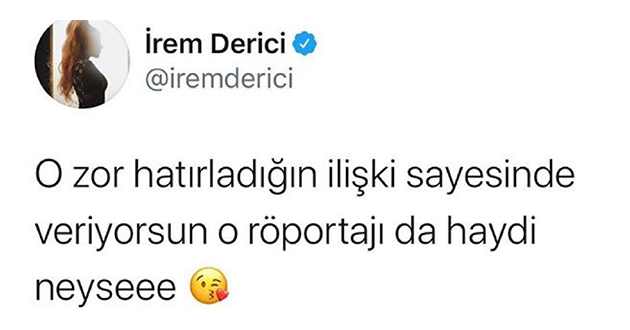 İrem Derici, eski sevgilisi Lider Şahin’in röportajda söylediklerini öğrendikten sonra sosyal medya hesabından dikkat çeken bir paylaşımda bulundu. “O zor hatırladığın ilişki sayesinde veriyorsun o röportajı da haydi neyse” şeklinde paylaşım yapan Derici dikkatleri üzerine çekti.