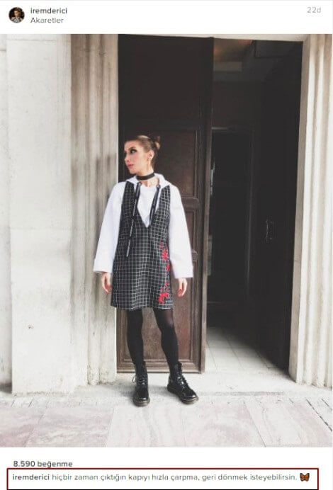 Okul formasına benzetilen bir kıyafetle poz veren ünlü şarkıcı İrem Derici, sosyal medyada paylaştığı bu fotoğrafın altına “Hiçbir zaman çıktığın kapıyı hızla çarpma, geri dönmek isteyebilirsin.” notunu yazdı. Derici’nin bu notu akıllara “Eski eşine gönderme mi yaptı?” sorusunu getirdi.