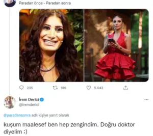Derici; estetik yaptırmadan önceki haliyle, şimdiki halini kıyaslayarak, “Paradan önce – paradan sonra” yazan Twitter hesabına şu cevabı verdi: