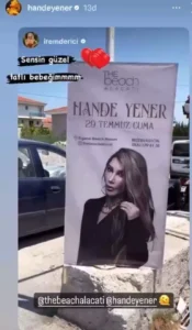 Derici, Hande Yener’in afişinin önünde çektiği videoda, “Dünyanın en güzel kadını Hande Yener’i görünce elim ayağım birbirine dolanıyor” dedi. Yener de bu gönderiyi kendi hesabından takipçileriyle paylaştı.