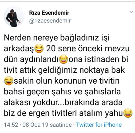 “Nereden nereye bağladınız işi arkadaş. 20 sene önceki mevzu dün aydınlandı. Ona istinaden bi tivit attık, geldiğimiz noktaya bak. Sakin olun konunun ve tivitin bahsi geçen şahıs ve şahıslarla alakası yoktur… Bırakın arada bizde ergen tivitleri atalım yahu.”