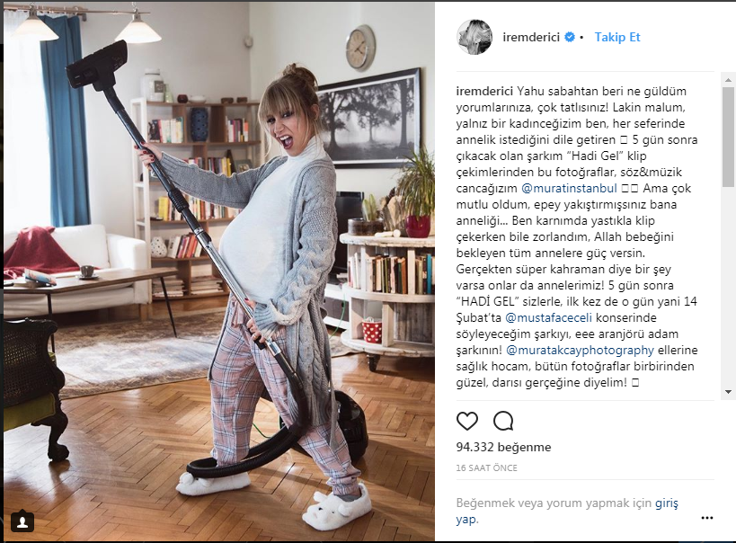 Bir sürü yorum alan İrem Derici çok geçmeden klibinden bir fotoğraf daha yayınlayarak açıklama kısmına,”Yahu sabahtan beri ne güldüm yorumlarınıza, çok tatlısınız! Lakin malum, yalnız bir kadınceğizim ben, her seferinde annelik istediğini dile getiren 5 gün sonra çıkacak olan şarkım “Hadi Gel” klip çekimlerinden bu fotoğraflar, söz&müzik cancağızım @muratinstanbul Ama çok mutlu oldum, epey yakıştırmışsınız bana anneliği… Ben karnımda yastıkla klip çekerken bile zorlandım, Allah bebeğini bekleyen tüm annelere güç versin. Gerçekten süper kahraman diye bir şey varsa onlar da annelerimiz! 5 gün sonra “HADİ GEL” sizlerle, ilk kez de o gün yani 14 Şubat’ta @mustafaceceli konserinde söyleyeceğim şarkıyı, eee aranjörü adam şarkının! @muratakcayphotography ellerine sağlık hocam, bütün fotoğraflar birbirinden güzel, darısı gerçeğine diyelim! ” dedi.