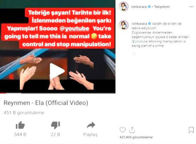 Işın Karaca, Reynmen’in izlenme rekorları kıran klibi için “Vallahi de billahi de tebrik ediyorum! Düşünsenize, dinlenmeden beğeniliyorsun, piyasa o kadar elinde! YouTube Allowing manipulation is being part of a crime! (YouTube Manipülasyona izin vermek suçun bir parçası olmaktır.)” paylaşımında bulundu. Reynmen, sosyal medya takipçilerinden gelen bir soru karşısında şarkısının milyon izlenmesine ünlülerden gelen tepkilere sert bir gönderme yaptı.