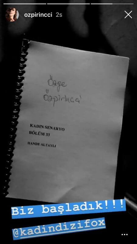 Salı akşamlarının en çok izlenilen dizisi Kadın herkesin bildiği gibi 5 Haziran Salı günü 32.bölümü ile sezon finali yaptı ve yaz arası verdi. Başrollerini Özge Özpirinçci, Caner Cindoruk ve Bennu Yıldırımlar’ın paylaştığı Kadın dizisi, ekranda ilgi ile izleniyor. Özge Özpirinçci, instagram hesabından yaptığı bir paylaşımla Kadın dizisi izleyenlere müjdeyi verdi. 33. bölüm senaryosu eline ulaşan ünlü oyuncu Özge Özpirinçci, güzel haberi izleyenlere sosyal medyadan paylaştı. Ünlü oyuncu Özge Özpirinçci “Biz başladık” notunu düştü. Bu paylaşımlar ise izleyiciyi bir nebze rahatlattı. Çekimlerin başlamış olması ise dizinin de bir kaç hafta sonra yayına gireceğinin müjdesi oldu.