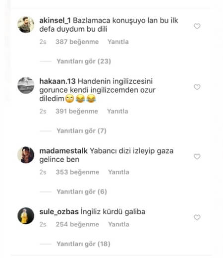 Hande Erçel’in videosuna kısa sürede binlerce yorum gelirken, kullanıcılar Hande Erçel’in İngilizce konuşması ile ilgili “bazlamaca konuşuyor ilk defa duydum bu dili, Hande’nin İngilizcesini görünce kendi İngilizcem’den özür diledim, yabancı dizi izleyip gaza gelince ben” şeklinde yorumlar yaptılar.