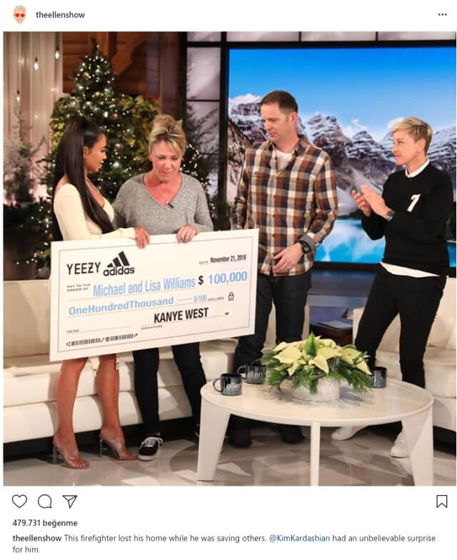 Ünlü komedyen Ellen, sosyal medya hesabından yaptığı paylaşımda “Bu itfaiye eri, başka evleri kurtarmaya çalışırken kendi evini kaybetti. Kim Kardashian, kendisine inanılmaz bir sürpriz yaptı.” notunu düştü.