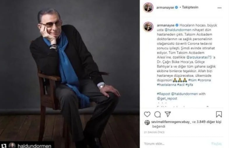 Harun Dormen’in gazeteci gelini Ayşe Arman ise “Hocaların hocası, büyük usta Haldun Dormen nihayet dün hastaneden çıktı. Doktor ve sağlık personelinin olağanüstü özverili koronavirüs tedavisi sonucu iyileşti. Şimdi evinde istirahat ediyor. Allah bizi hastaneye düşürecekse, ülkemizde düşürsün” dedi.