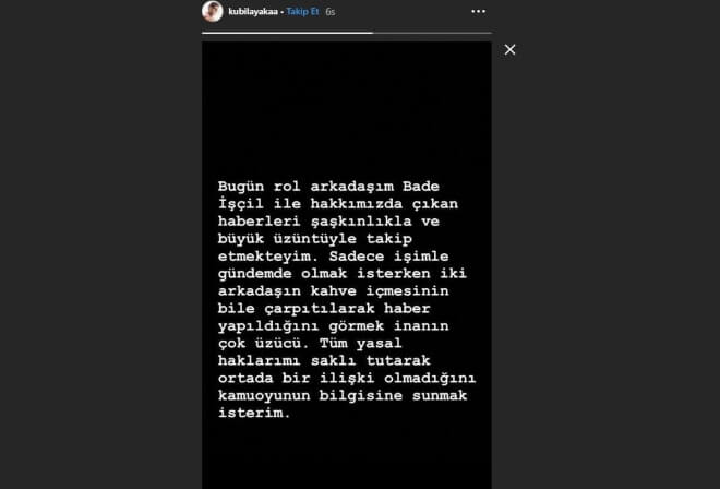 Geçtiğimiz gün Bade İşçil‘le bir kafede görüntülenen Kubilay Aka’nın adı Hilal Altınbilek’in ardından Bade İşçil’le aşk dedikodularına karıştı. İddialar karşısında bu defa sessiz kalmayan ünlü oyuncu sosyal medya hesabından bir açıklama yaptı. Haklarında çıkan haberleri şaşkınlıkla okuduğunu dile getiren Aka, iki arkadaşın kahve içmesinin çarpıtıldığını dile getirerek “Tüm yasal haklarımı saklı tutarak ortada bir ilişki olmadığını kamuoyunu bilgisine sunmak isterim.” açıklamasını yaptı.