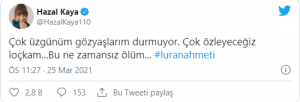 Luran Ahmedi’nin ölüm haberini alan hayranları yasa boğuldu bir çok ünlü isim baş sağlığı diledi sosyal medya hesaplarından hüzünlerini paylaştı Hazal kayada onlar dan biriydi yasını şu sözlerle dile getiren Kaya “Çok üzgünüm gözyaşlarım durmuyor. Çok özleyeceğiz loçkam… Bu ne zamansız ölüm…” dedi.