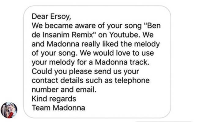 Instagram sayfasına Madonna tarafından mesaj gönderildiğini açıklayan Madonna’nın yardımcıları aracılığıyla kendisine ulaştığını ve 2017 yılında bestelediği “Ben de İnsanım” şarkısının remiks melodisine talip olduğunu dile getirdi. Başta sahte hesap olduğunu ancak sonrasında hesabı kontrol edince çok şaşırdığını belirten Dinç “Bana ‘Rahat olabilirsin. Biz Madonna’nın ekibindeniz, bu numaradan bize ulaşabilirsin’ diye cevap attılar. Ardından Madonna’nın ekibinden Richard diye biri beni aradı, ‘Ben de İnsanım’ isimli şarkımın melodisine talip olduklarını söyledi. Madonna’nın oryantal müzik projesinde kullanacaklarmış.” Ersoy Dinç yakında Amerika’ya gidip Madonna’yla bir araya geleceğini belirterek “Benden hukuki konular için bir danışman bulmamı istediler. Şu an danışmanımla yazışıyorlar. Bana davet gönderip Amerika’da şarkıyı dinleteceklerini söylediler. ‘Madonna ile tanışabilir miyim?’ diye sordum, ‘Tabii ki gelince tanışabilirsiniz’ dediler.” açıklamasını yaptı.
